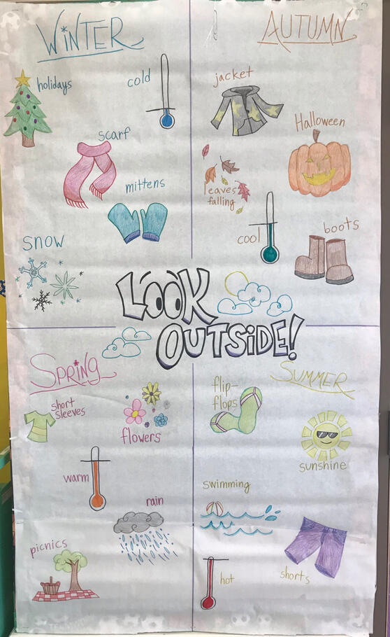 My lesson was during a unit about the seasons, so I sang and played an interactive song. This was to help the students learn to associate things with the seasons (clothes to wear, weather, etc.) The kids loved it, and it helped set the stage for the unit to come.