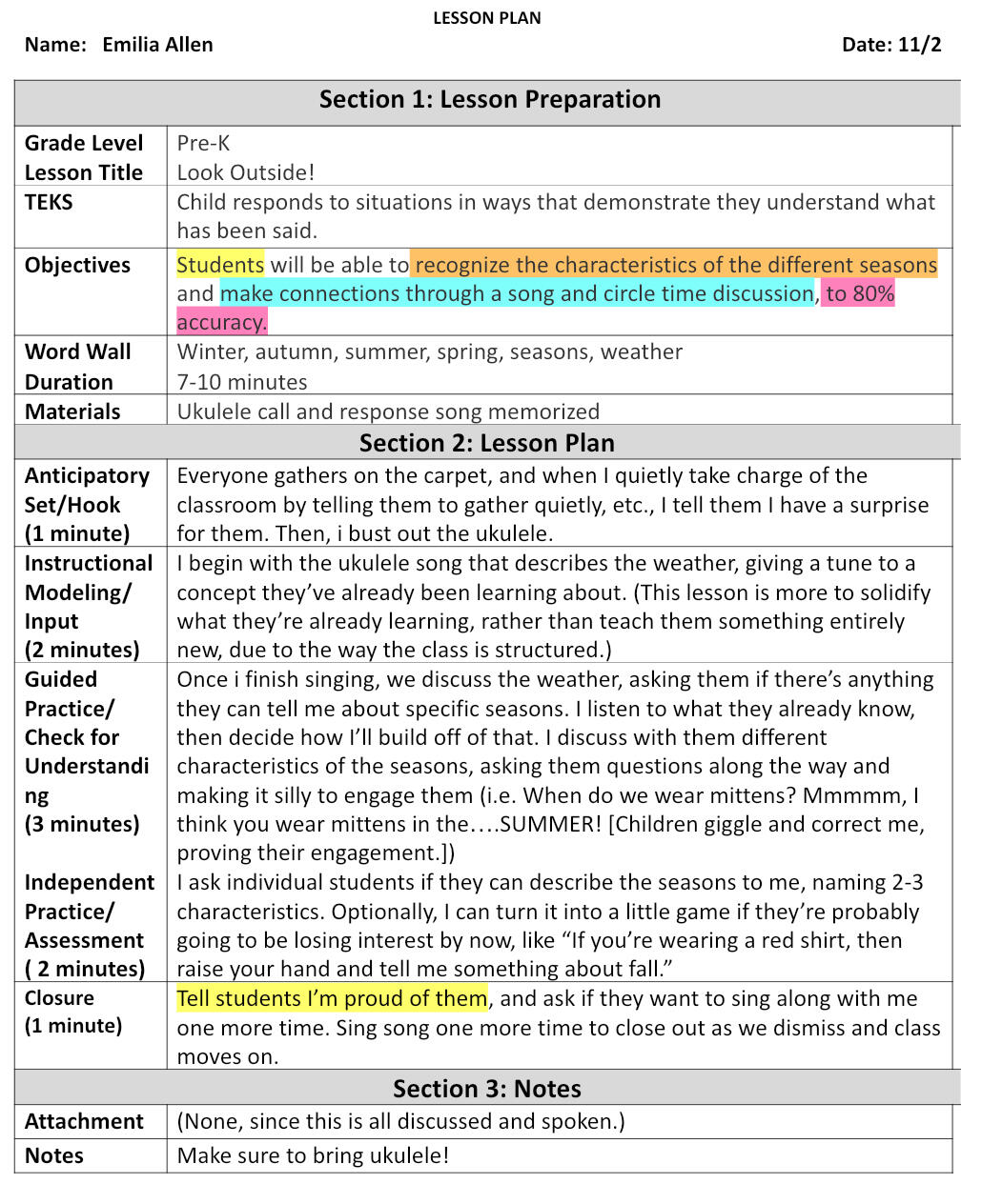My lesson was during a unit about the seasons, so I sang and played an interactive song. This was to help the students learn to associate things with the seasons (clothes to wear, weather, etc.) The kids loved it, and it helped set the stage for the unit to come.